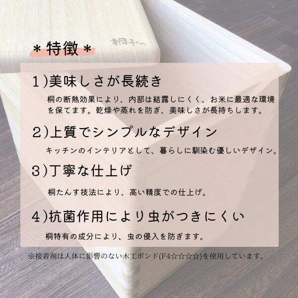 食品の保存に適した桐素材はお米の風味や鮮度を長持ちさせるので、お米をいつでも美味しく保つことができます。