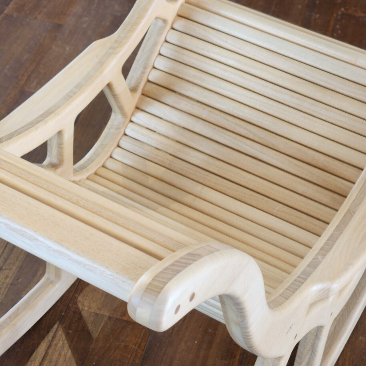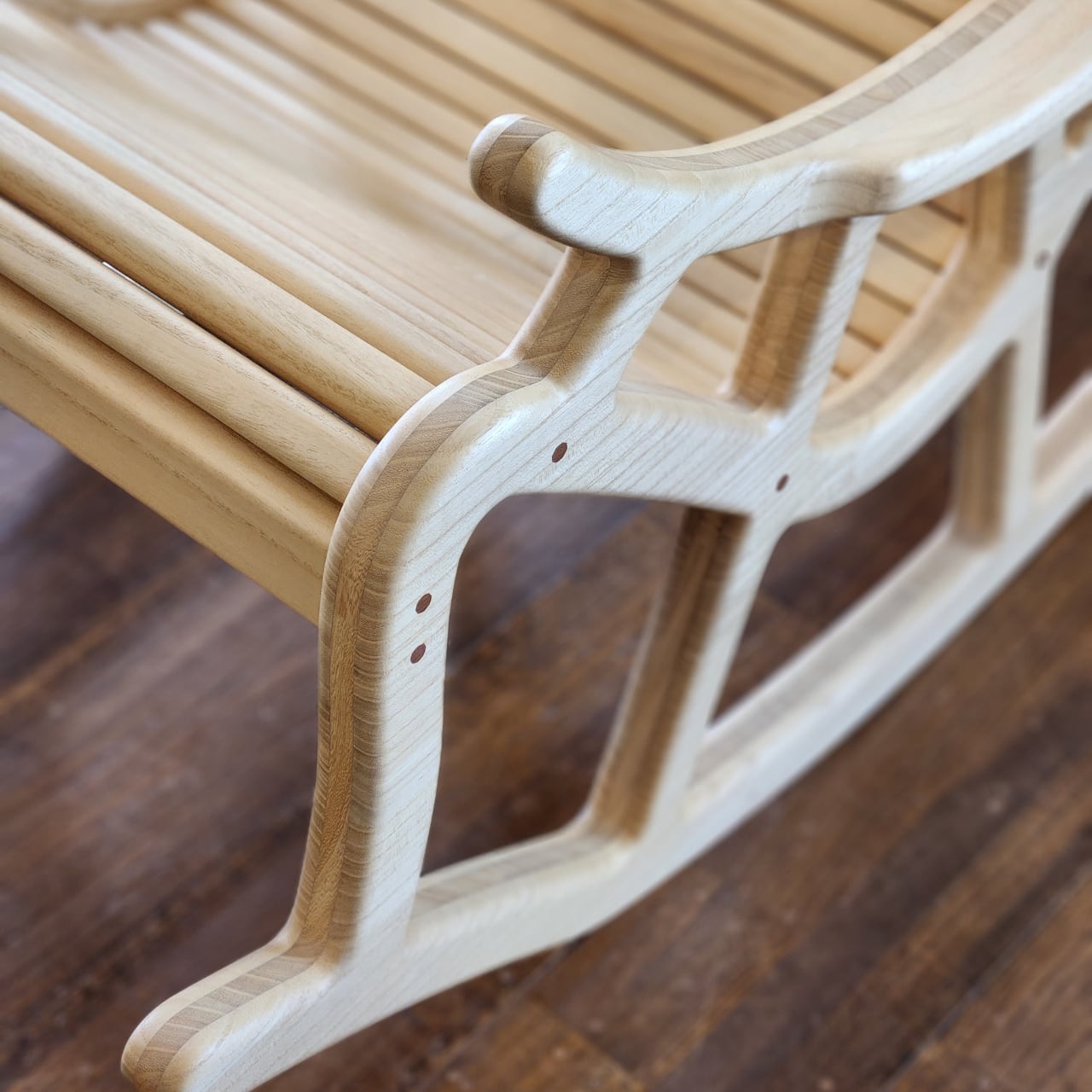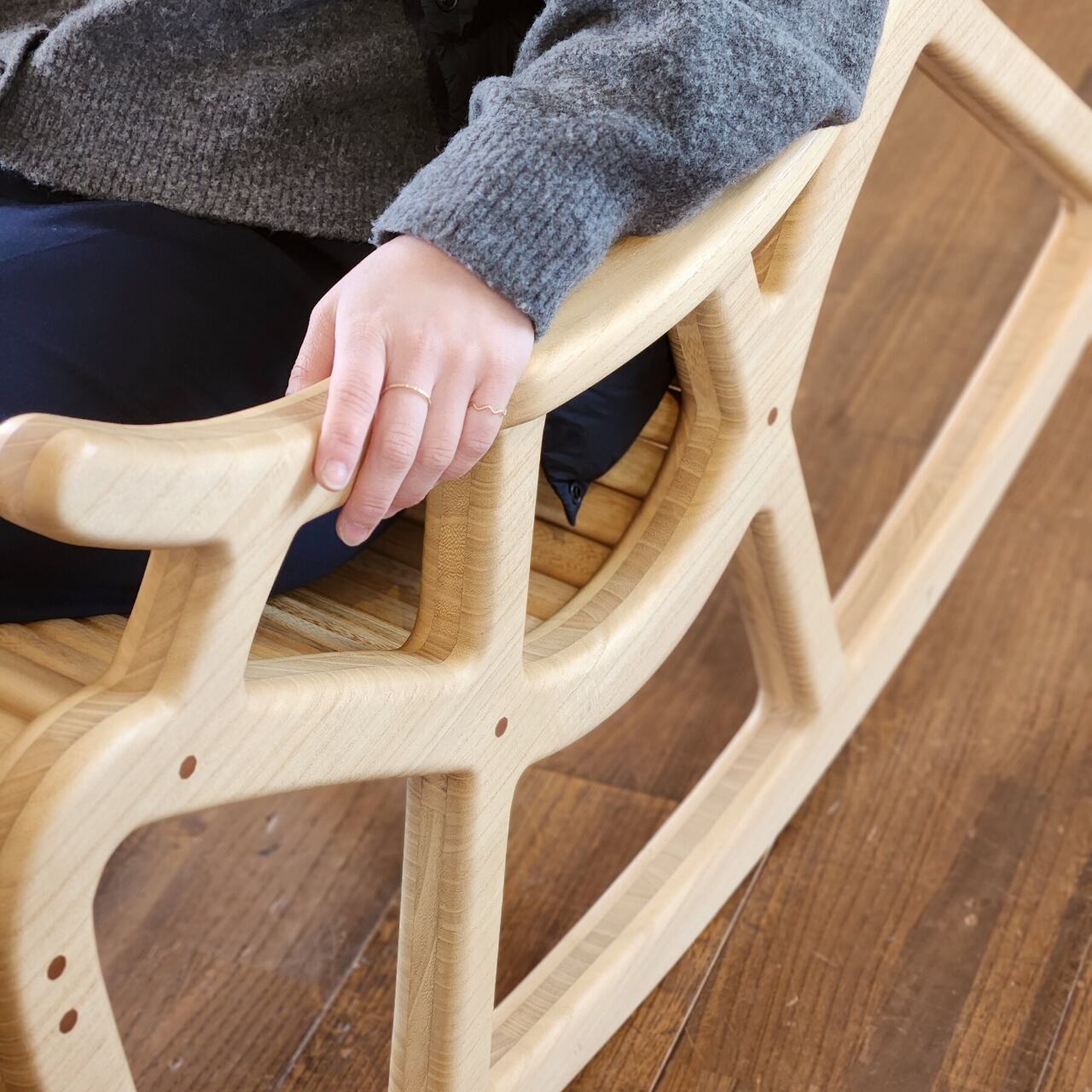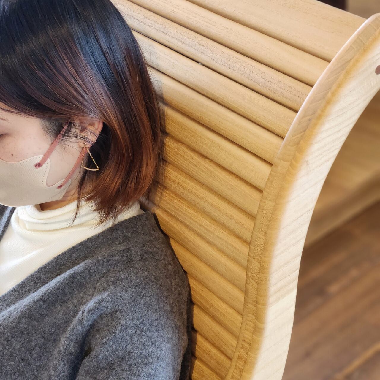 中でも、桐のロッキングチェア「ゆらりいす」は、桐子モダンの特徴であるなめらかでやさしい肌触りを身体全体で体感して頂けます。